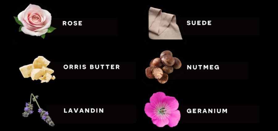 ミドル:ローズ、スエード、オリスバター、ナツメグ、ラバンディン、ゼラニウム、ダバナ、